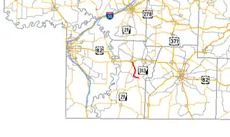 Arkansas Highway 313 is a north–south state highway in Lafayette County. The route runs 9.00 miles (14.48 km) from Arkansas Highway 53 north to Arkansas Highway 29 in Lewisville.[2] The route does not intersect any other state highways.