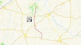 Highway 57 runs north from US 82 to Highway 160 before turning west and entering Columbia County.[3] The highway runs briefly through the northeast corner of the county, and does not have any state highway junctions in Columbia County.[4] Entering the southwest corner of Ouachita County, Highway 57 enters Stephens, where it intersects US 79. A brief overlap with US 79 begins northward toward Camden, but Highway 57 turns west north of downtown Stephens. Continuing north, Highway 57 has intersections with Highway 332 at Troy, US 278, and Highway 76/Highway 387 near White Oak Lake State Park. The route intersects Highway 24 in Chidester, where it terminates.[5]