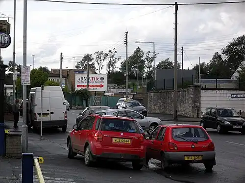 ![]() Loughgall Road in Armagh – the old GNRI railway station was where the Ulsterbus sign (extreme right) is today | |