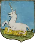 Coat of arms of the Alicorni (1673) The Alicorni were a noble Albanian family who fled the Ottoman advance of their homeland during Pope Pius II’s reign (r. 1458–1464). Seeking refuge in Milan, Pavia, Forlì and eventually Rome, they attained high status through matrimonial alliances with other Italian nobility: among them the Ricci, Cayni, Trivulzi, Pusterla, Colli Aleotti, Leccilio, Colli Armentieri and Capranica.[118] Messer Traiano was a Conservator (one of the three city councillors), who had his residence, today known as Palazzo Alicorni, erected in the rione of Campo Marzio, not far from Piazza del Popolo, at the beginning of the sixteenth century. He left behind two sons, Giovanni Battista and Fabius, who were both appointed knights by the Pope. On July 3, 1584, Giovanni sold the palace to the French cardinal Matteo Contarelli, Datario of Pope Gregory XIII (r. 1572–85). Cornelia was granted the fideicommissum (entailed estate) from a ruling issued by Deacon Dunozzetto on June 27, 1650. The family lineage ended at the dawn of the 20th century with Francesco, the last male heir of Traiano.[119]