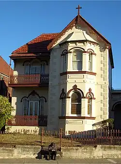 Athelstane, owned by W.G. Judd, was a notable home in the district. The large house gave its name to the avenue it was built on and later became the site of Athelstane Public School. Another main street, Barden Street, was named after Frederick Barden whose house, Highbery Heights, stood nearby. Arncliffe had many grand and gracious Victorian era houses. Too many have been demolished, or fallen into disrepair, been subdivided and so on, but in the most recent years there have been some attempts to preserve these as part of local heritage. Two-storey semi-detached dwellings, Gladstone and Wentworth on Forest Road, were built by Hurstville builder Robert Newell for rental to 'well to do' tenants. Dappeto on Wollongong Road built in 1885 by oyster merchant Frederick Gibbins, later became a home for children and now houses a Salvation Army chapel, as part of a nursing home and retirement village. 'Belmont' and 'Fairview' are identical Victorian homes built in 1884 by two Irish brothers Thomas and Alexander Milsop, who made their fortunes in the goldfields. 'Meryton' was erected by building contractor Alexander Fell in 1885. 'Coburra' was built in 1905 but was more typical of the earlier Victorian era. Arncliffe Post office is a Federation style building opened in 1906 and originally contained the post master's residence upstairs.[4]