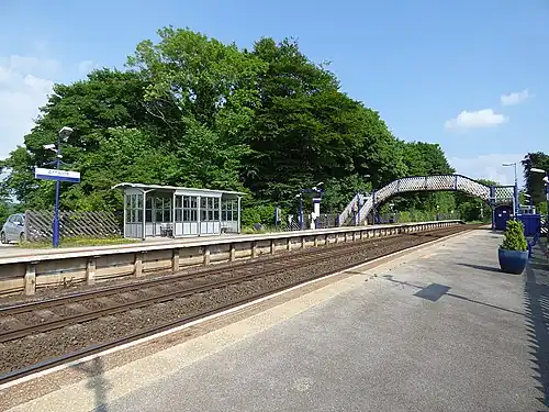 Whilst one building remains at the station, it is not in railway use. Shelters are provided for passengers on both platforms, but the only link between them is via a footbridge with stairs (no step-free access).[3] Digital information screens, customer help points, timetable posters and automated announcements provide train running details. As the station is unstaffed, tickets can only be bought from the ticket machine or on the train.
