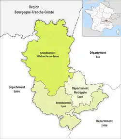 In 1800, the arrondissements of Lyon and Villefranche were established.[2] On 1 January 2015, 101 communes that did not join the newly created Metropolis of Lyon passed from the arrondissement of Lyon to the arrondissement of Villefranche-sur-Saône.[3] On 1 February 2017, 78 communes passed from the arrondissement of Villefranche-sur-Saône to the arrondissement of Lyon.[4]