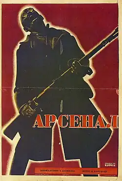 Arsenal (Russian: Арсенал; Ukrainian: Арсенал; alternate title: January Uprising in Kiev in 1918)[1] is a 1929 silent Soviet drama film by Alexander Dovzhenko.[2] The film depicts events following the 1917 October Revolution in Russia and the subsequent Russian Civil War, and is a highly symbolic and poetic portrayal of the revolutionary spirit and the struggle for power. The film was shot at Odessa Film Factory of VUFKU by cameraman Danyl Demutskyi and used original sets made by Volodymyr Muller. The expressionist imagery, camera work and original drama were said to take the film far beyond the usual propaganda and made it one of the most important pieces of Ukrainian avant-garde cinema.[3][4] The film was made in 1928 and released early in 1929.[1][5] It is the second film in Dovzhenko's "Ukraine Trilogy", the first being Zvenigora (1928) and the third being Earth (1930).