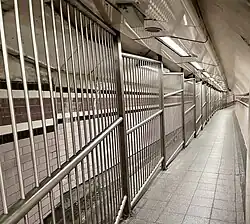 Passageway linking the ticket office to the platforms, looking towards the latter. Note tidal flow segregation, in operation on football match days. The fans would use the wider section.