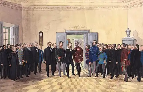 Among the generals whom the Hungarian officers would accept as the supreme commander, Görgei was the most popular; and in an officers meeting held in Tiszafüred, in the presence of the government's chief commissary Bertalan Szemere, they elected Görgei as the commander-in-chief, with their decision ratified by Szemere. When Kossuth heard about this, he was angered and rushed to the military camp, thinking that Görgei was its organizer and declaring that he would order Görgei executed for this revolt. But when he arrived at Tiszafüred and saw that the majority of the officers supported Görgei, Kossuth was forced to accept the situation. However, he declared that the final decision about who would be the commander would be announced after he presented the facts to the Parliament.[28] In Debrecen, Kossuth and his political supporters ignored the wishes of the Hungarian generals to name Görgei and designated Antal Vetter as commander-in-chief.[29] On 8 March, by way of consolation, Görgei was decorated with the Second Class Military Order of Merit.[30]