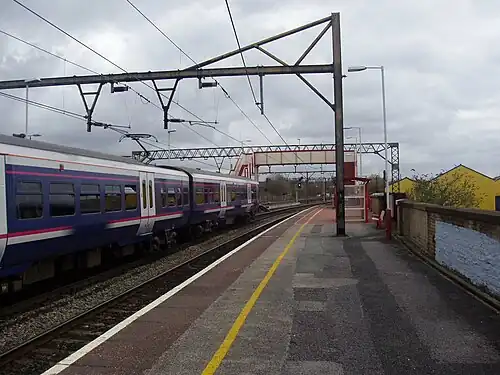The line was electrified at 25 kV AC on 10 December 1984; it replaced the 1500 V DC electrification, which was inaugurated on 14 June 1954 by British Railways as part of the Manchester-Sheffield-Wath scheme via the Woodhead Tunnel.[8] There was also a signal box here, which controlled the junctions and various sidings. The signal box, opened in 1906 by the Great Central Railway, closed in 2011, when control was transferred to the Manchester East signalling control centre.[9][10] The new WCML North Rail Operating Centre is located a short distance east of the station, next to the line to Guide Bridge. This opened in 2014 (one of 11 such centres either built or being planned in the UK) and will eventually control signalling across most of the routes across the North West England, including the northern end of the West Coast Main Line and the entire Manchester area network.[11]