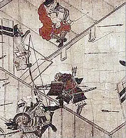 Mochiuji's eldest son Yoshihisa, 14 years old at the time, was also forced to kill himself at nearby Hōkoku-ji.[7] His three younger sons however escaped to Nikkō and in 1440 were led by Yūki Ujitomo, head of the Yūki clan, to his castle in Koga, Shimōsa Province, and survived.[8] When later his castle was attacked by the shogunate, they escaped. Two, Haruō-maru and Yasuō-maru, were caught and executed.[8] The lone survivor, Mochiuji's fourth child Shigeuji, would later become the last Kantō kubō.