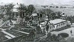 In 1936, the church was rebuilt into a restaurant, and in 1938, architect Petro Yurchenko quite wittily converted the former church into a park pavilion, adding a through Ionic colonnade instead of a dome.[1] At the same time, the early twentieth-century bell tower, the rector's house, and the 1860s fence were demolished.