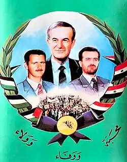 Assadism (Arabic: اسدية, romanizedʾAsadiyah) is a far-left[1] ideology and a variant of the neo-Ba'athist ideology based on the policies and thinking of the Assad family, which governed Syria as a totalitarian hereditary dictatorship from 1971 to 2024.[2][3] Assadism was characterized by Arab nationalism, socialism, totalitarianism, extreme militarism, and a cult of personality around the Assad family. This period spanned the successive regimes of Hafez al-Assad and his son Bashar al-Assad. The Assads rose to power as a result of the 1970 Syrian coup d'état, leading to the consolidation of Alawite minority dominance within the military and security forces. Their governance was largely characterized by nepotism, sectarianism, and ethnic favoritism.[4] The ideology enshrines the Assad family's leadership role in Syrian politics and presented the Assad regime in a very personalist fashion, creating a government based upon and revolving around its leader. Under this system, the Syrian Ba'ath Party portrayed the wisdom of Assad as "beyond the comprehension of the average citizen."[5] Syrian state propaganda cast Assadism as a neo-Ba'athist current that evolved Ba'athist ideology with the needs of the modern era.[6]