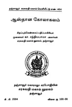 2. ^ K. Sthyabhama (2004). Asthana Kolakalam. Thanjavur, Tamil Nadu: Sarasvathi Mahal Library. Retrieved 5 July 2024.