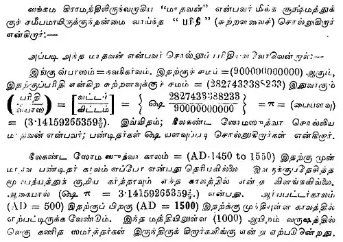 One interesting feature of this work is that bulk of the work has been devoted to discussing topics in mathematics not contained in the various stanzas of the original manuscript. After completing the explanation of stanza 46 in page 52, the editor embarks on a grand detour of various topics in mathematics and returns to stanza 47 only in page 140. The context for this digression is apparently the value of the mathematical constant pi. The topics covered in this detour include the history of the computations of the value of pi (incidentally, he mentions Sangamagrama Madhava's approximate value of pi also, namely the value 2827433388233/(9 x 1011) ), the various trigonometric functions, formula for the area of a circle, formulas for the surface area and volume of cones, cylinders, etc., formulas for the circumference and area of ellipses, Pythagorean theorem and several related geometrical problems.[3]