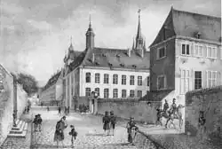 On 15 May 1585, Pope Sixtus V signed a Papal bull granting the Jesuit Order the right to establish a school in Luxembourg.[1] The school was eventually founded in 1603 by the Jesuit Order,[2][3] and was located next to the Notre Dame Cathedral, in the Ville Haute quarter. It was modelled on the Jesuit school in Trier. The school flourished and in 1684 it was expanded.[4] After the Suppression of the Society of Jesus by Pope Clement XIV in 1773, the school was renamed the Collège royal,[5] and was put under auspices of the clergy. Furthermore, the school's curriculum was reformed and expanded.
