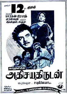 Athisaya Thirudan (transl. Crafty Thief) is 1958 Indian Tamil-language film directed by P. Pullayya and written by Thanjai N. Ramaiah Dass. The soundtrack was composed by S. Dakshinamurthi and K. Prasad Rao. The film stars Gemini Ganesan portraying the titular character, with Savitri, T. S. Balaiah, K. A. Thangavelu, T. P. Muthulakshmi and V. Nagayya in supporting roles.[1]