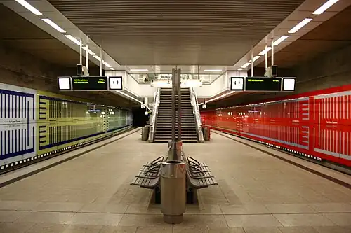 Auf dem Damm is an underground Duisburg Stadtbahn station, located in Duisburg-Meiderich, named after the street "Auf dem Damm", under which it is located. The station was opened in 2000, when the overground tram route from Meiderich to Duissern was replaced by the underground section. The former route was not guided via Auf dem Damm, so before the opening of the new line, this area had no connection to the light rail network. Auf dem Damm station was designed by Eberhard Bosslet.