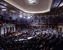 - For the first, and only, time in Australian history, the two houses of the Parliament of Australia convened as a combined 187-member body. All 127 members of the House of Representatives and all 60 Australian Senators participated in a two-day session inside the chambers of the House to debate and vote on six bills.[56] The first legislation passed was the "one vote, one value" reform (96 for, 91 against) followed by an act to give representation in the Senate for the Australian Capital Territory and for the Northern Territory (97 for, 90 against).[57][58]