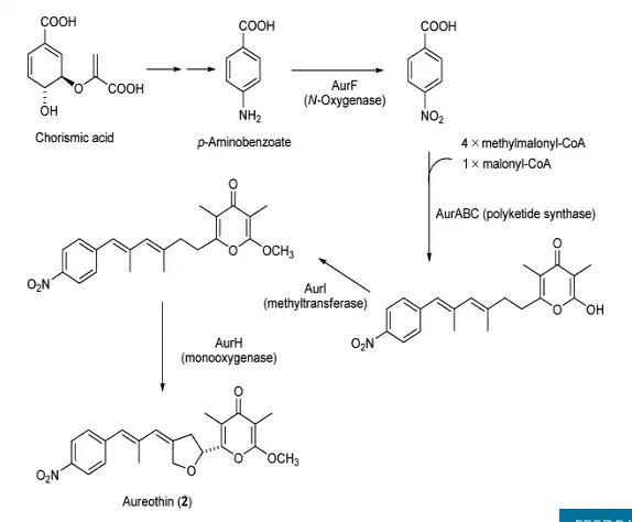 Regarding the biosynthesis of aureothin, the biosynthetic pathway would be begun with chorismic acid. P-nitrobenzoate is derived from p-aminobenzoate by an N-oxygenase, which is encoded by aurF.[7] The aurF is one of the aureothin biosynthetic enzymes and it is referred to as a nonheme diiron oxygenase that is responsible for converting p-aminobenzoate to p-nitrobenzoate.[8] Moreover, the aurF catalyzes a reaction of a complete six-electron oxidation utilizing two equivalents of dioxygen and two exogenous electrons in order to convert p-aminobenzoate to p-nitrobenzoate.[8] Then, three type I Polyketide Synthases (PKSs), which is encoded by aurA, aurB, and aurC, generates the a polyketide chain using p-nitrobenzoate as a starter unit[9] for the biosynthesis of aureothin. At this point, the repetition that one molecule catalyzes two successive cycles of chain extension would occur in the reaction of the type I Polyketide Synthase (PKS).[10] In particular, the two consecutive cycles containing four times of methylmalonyl-CoA and one time of malonyl-CoA occur during the type I Polyketide Synthase (PKS). After O-methylation is activated by a methyltransferase, which is encoded by aurI, the tetrahydrofuran ring formation is produced by a monooxygenase that is encoded by aurH. Therefore, the final product, aureothin, is produced as a result of the monooxygenase encoded by aurH.[11]