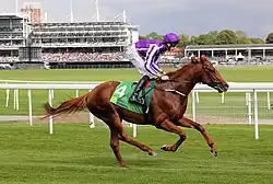 In October 2012, the yearling was sent to the Tattersalls sales where he was bought for 525,000 guineas by the bloodstock agent Dermot "Demi" O'Byrne acting on behalf of John Magnier's Coolmore organisation.[5] For racing purposes, Australia ran in the ownership of a partnership consisting of Susan Magnier, Derrick Smith, Michael Tabor and the Malaysian architect and entrepreneur Teo Ah Khing of Desert Star Holdings.[6] Jockey Joseph O'Brien rode Australia in all the races of his career and wore the purple silks of Derrick Smith on all those occasions.