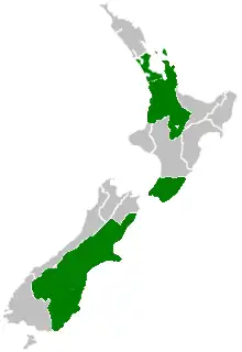 Map of New Zealand showing regions where Australian rules football in 2007 was organised in green