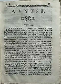 From 1684 the Republic of Genoa hadn't had any newspaper, until Giuseppe Lomellini became Doge on 4 February 1777.[2] The next 29 March 1777 was published the first issue of the Foglio di notizie ed avvisi diversi (in English: Paper of news and various tidings) by Andrea Corradi.[1] From the issue number six, dated 3 May 1777, the title changes simply in Avvisi and so it remained up to the last issue.[3]