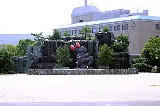 • Komatsushima Station Park Statue: In 1993 (Heisei 5), the world's largest bronze statue of Kinchō was unveiled in Komatsushima Station Park.[5][27] Standing 5 meters tall, with a circumference of 5 meters and weighing 5 tons,[27] it serves as a symbol of Komatsushima[50] and is popular with tourists.[17] While Shigaraki ware tanuki figurines are famous, and Shigaraki (now Kōka City, Shiga Prefecture) has an 8-meter tall ceramic tanuki, the Komatsushima statue is the world's largest bronze tanuki.[27] The park also features stone statues of other tanuki from the legend.[40]