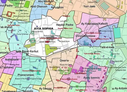 Ayia Sophia is one of the 24 historic quarters within the walls of Nicosia.[2] During the Ottoman period it was counted as one of the moslem quarters of Nicosia. [20][21] The 1831 census reported the population was 100% moslem.[9] Ottoman census data indicates that the highest ranking Ottoman administrative officials for Cyprus resided in Ayia Sophia quarter during the 19th century.[18] Later, the moslem or Turkish Cypriot character of the neighbourhood waned and by 1946, Ayia Sophia had a population of 632 Greek Cypriots, 1239 Turkish Cypriots, and 65 others, still 64% Turkish Cypriot.[2]