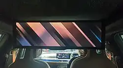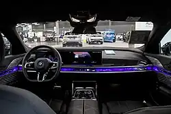 The G70 receives the "BMW Live Cockpit" setup, which combines a 310 mm (12.3 in) digital instrument cluster with a BMW's 14.9 in (380 mm) Curved Display for the infotainment touchscreen, which both run BMW iDrive 8, the newest iteration of BMW's infotainment system.[34] The G70 also features navigation, wireless Apple CarPlay and Android Auto, DAB+ radio, over-the-air updating, and a range of third-party apps as well as in-car gaming.[37] Additionally, a head-up display with different views is standard.[34] Optional on the 7 Series is a large 800 mm (31.3 in), 8,000-pixel "Theatre Screen". When being used, this display can stream movies and shows from Amazon Fire TV via the eSIM connection, or a device can be hooked up via an HDMI cable to stream any show. A camera is standard on the screen, which can stream meetings or video calls while in the vehicle. Buyers may subscribe to other streaming services such as Netflix, Hulu and Max.[38][34][39] Additional luxuries include heated front and rear seats, heated steering wheel, heated surface, front centre console armrest, front seat ventilation, front seat massage function, quad-zone climate control, and BMW's Panoramic Glass Roof Sky Lounge.[34][40]