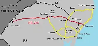 BR-285 is an east-west Brazilian federal highway that starts in Araranguá, Santa Catarina, and crosses the Gaucho range and highlands. It stretches approximately 674.5 km, passing through cities such as Vacaria, Lagoa Vermelha, Passo Fundo, Carazinho, Ijuí e São Luiz Gonzaga, and ends in São Borja, Rio Grande do Sul, on the border of Argentina.[2]