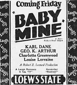 Baby Mine is a 1928 silent film comedy produced and distributed by Metro-Goldwyn-Mayer. This film is a remake of the 1917 film Baby Mine, both being based on Margaret Mayo's 1910 Broadway comedy Baby Mine. This film stars Karl Dane, George K. Arthur and Charlotte Greenwood.[1][2][3]