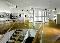 From 2005 to 2007, the buildings to the west of the Bach House were replaced by a new museum building, the historical building again underwent restoration, and the exhibition was completely modernized. The project was financed by the Free State of Thuringia, the government of the Federal Republic of Germany and the European Union, with a grant totalling 4.3 mio. Euros.[27] Earlier, the New Bach Society had purchased the properties Frauenplan 21a and 23 (which before had only been rented) with donations by its members. A new, smaller building to the back of the Bach House garden had already been put up in 2001, it contains a study hall for school classes and a library. The demolition of the 19th century buildings to the west of the Bach House in 2000 and 2001 was subject of heavy debate among the Eisenach citizens.[28] The same is true for the finally realized new museum building with its modern organic design by architect Prof. Berthold Penkhues from Kassel, Germany, a former student of Frank O. Gehry. Penkhues' design had won first prize among twelve submissions in an architectural design contest to which the New Bach Society had invited in 2002.[29] The new exhibition was designed by Prof. Uwe Brückner, Stuttgart, Germany.[30]