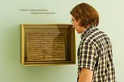 As the first and – for a long time – only Bach museum, the museum's mandate by the New Bach Society was to "collect everything that concerns Johann Sebastian Bach, his life and works, and his reception."[71] However, when the museum was founded in 1907, this mandate was already quite impossible to fulfill. Eighty percent of all known Bach autographs were (and still are) in the possession of the Berlin State Library,[72] and already at the time, private collectors willing to part with what was left were demanding prices far exceeding the means of a private society.[73] Still, in its early years the following autographs were acquired by the Bach House:[74]