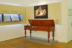 Since 1973, five baroque keyboard instruments are demonstrated in a music performance every hour.[52] These include two chamber organs (Switzerland, ca. 1750,[53] and Thuringia, ca. 1650), a fretted clavichord (around 1770),[54] and a spinet built 1765 in Strasbourg by Johann Heinrich Silbermann, a nephew of Gottfried Silbermann whose instruments Bach helped sell in Leipzig.[55] The Thuringian positive organ's history and Bach's biography overlap: from 1714 on, it served as a church organ in Kleinschwabhausen, about 15 km from Weimar where Bach was court organist at the time. Bach's protégée and family friend, the court organ maker Heinrich Nicolaus Trebs, repaired the organ in 1724 and 1740, and Johann Caspar Vogler, Bach's student and successor as court organist, tested the organ in 1738, 1740 and 1744. Since inspecting the dukedom's organs belonged to the court organist's duties, the museum conjectures that Bach must have known and played this instrument, even though there is no record of it.[56]