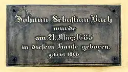 In the wake of the 19th century's Bach renaissance instigated by Felix Mendelssohn Bartholdy and Robert Schumann, among others, devotees went on a search for memorabilia and also for the birthplace of the composer. In 1857, the Bach biographer Karl Hermann Bitter interviewed the still living descendants of Johann Bernhard Bach and determined that Bach was born at the house Frauenplan 21, subsequently called Bachhaus (Bach House).[13] In 1868, the local music society dedicated the memorial plate above the front entrance, thus publicly marking the place as Bach's birthplace.[14] Since then, however, no further evidence in support of this claim has surfaced. An error in the local oral tradition which Bitter encountered can perhaps be attributed to the fact that members of the Bach family did indeed live in this house once, but only at a time long after Bach's birth.