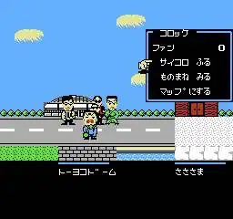 Bakushō! Star Monomane Shitennō (爆笑! スターものまね四天王; "A Hearty Laugh! Imitation of the Four Heavenly Kings Star") is a Nintendo Family Computer life simulation video game that portrays the life of either a musician or a famous performer of the monomane (模倣; "imitation") style of Japanese theatre.[3] The object is to gain popularity while performing concert tours through the fictional city. Celebrity challenges are included in the game; they are considered to be miniature games like swimming and kicking a giant ball into a goal in a manner similar to soccer.[3] While these games are fun to play, losing results in a loss of popularity points similar to performing terribly at a concert.