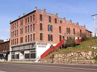 The Baldwin Hotel is a historic hotel building in Klamath Falls, Oregon, in the United States. It was built in 1905 and added to the National Register of Historic Places on October 2, 1973.[2] Originally built to be a hardware store by George Baldwin, the building was converted into a hotel in 1911 as George saw the potential profit from the railroad coming to town. He anticipated the railroad to come by the Link River, across the street from the building's location. Unfortunately for George, the railroad was instead built at the other end of Main Street, by the current Klamath County Museum. Nonetheless, the hotel was built and operated with unique characteristics. As the site of construction was a rocky hillside, the building was constructed by carving away the basalt and creating an incredibly sturdy foundation. This hotel has almost all rooms connected in order to create the ability to rent out either one room, or an entire suite of rooms. George's thinking behind this was that people would want to be able to have an office and apartment all connected. It also was the first building to have indoor plumbing in every room, even though running water wasn't available until 1908.