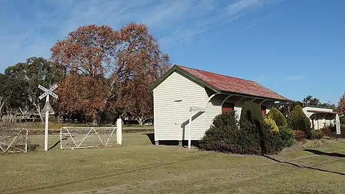 Ballanden railway station with Fruitisforus beside the New England Highway, 2015