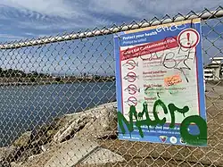 LA County Public Works deployed an Interceptor Original, a solar-powered, automated system made by the Dutch nonprofit The Ocean Cleanup, near the mouth of the creek in October 2022.[68] This is the first Interceptor Original installed in the United States, and the second of the third-generation Interceptor Original to be deployed globally.[69] Until the system was put into place, it was docked with the United States Coast Guard in Long Beach, California.[70][71] One boom on the device was damaged in the 2022-2023 storms but the main unit was not damaged.[72]