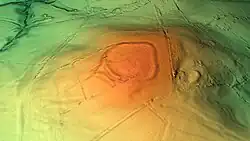 There is an original entrance on the west side, protected by an external bank 15 metres (49 ft) wide and 1 metre (3.3 ft) high, with traces of an external ditch. This bank, branching out from the north west part of the rampart, runs south-west and then curves towards the fort, so that there is a passage into the fort from the south, at one point down to about 2 metres (6.6 ft) wide.[1][2]