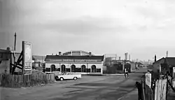 From Farthinghoe the track curved round to the west to run nearly parallel with the Great Western's line from Oxford to Banbury before entering Merton Street (21+34 miles (35.0 km) from Bletchley). The wooden main station building was frugally built with a timber island platform covered by a glazed roof supported by steel columns. A timber goods shed was initially provided to be later rebuilt in brick. The locomotive shed had capacity for eight engines and up to 1934 acted as a sub-depot for Bletchley with men rostered there. A cattle dock and sidings were provided to handle the substantial agricultural traffic; sidings also led to the nearby gasworks and the Great Western's Banbury yard.[13] The timber boarding on the station roof had by 1956 reached such a condition that it posed a danger to passengers and it was removed leaving the metal supports and piping which were painted white.[14]
