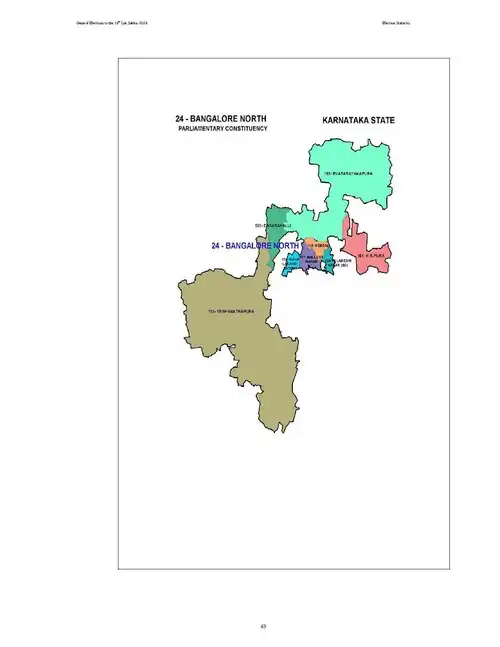 Bangalore North Lok Sabha constituency is one of the 28 Lok Sabha (lower house of the Indian Parliament) constituencies in the South Indian state of Karnataka. This constituency has been known by different names in its history. For the 1951 and every election since 1977 it has been known as Bangalore North. For the 1957 and 1962 elections it was known as Bangalore City. For the 1967 and 1971 elections it formed a constituency jointly with Bangalore South and was known as Bangalore. From 1951–73, this constituency resided in Mysore State. On 1 November 1973, Mysuru State was renamed as Karnataka.[2]