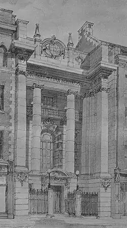 The property the bank purchased comprised two main buildings: the William Cawthra House on the corner, and the Canada Life Building to its east. The Cawthra House had been built in 1852 and was designed either by Joseph Sheard or his partner William Irving. The Cawthras occupied the house until 1885. It was owned subsequently by the Molsons Bank (1885–1907), Sterling Bank (1907–1925), and Canada Life (1925–1929). Historian William Dendy said it was "without doubt the finest and most elegant town house built in Toronto."[10] The Canada Life Building had been built in 1887 and was designed by Richard Alfred Waite.[11]