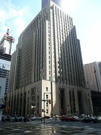 The origins of the Bank of Nova Scotia Building lay in the September 1928 purchase by Canada Life of a large property at University Avenue and Queen Street, where it would build the new Canada Life Building.[5] The purchase confirmed that the company's current property at King and Bay would be put up for sale. In October 1928, rumours began to circulate that the prospective buyer was the Bank of Nova Scotia.[6] By January 1929, Canada Life stated that "an imposing building that will be erected at King and Bay Streets when the Canada Life has moved up to University Avenue," although still it did not indicate which bank this would be. At the time, the Canadian Bank of Commerce was about to begin construction of the new Commerce Tower at King and Jordan. One rumour was that it was going to stop this work, change plans, and build on the Canada Life site instead.[7] At Canada Life's annual meeting in January 1929, president Leighton McCarthy reported on the purchase of the site at University and said of the property on King that "your directors believe that it is not economically wise or necessary for an insurance company to occupy such a valuable site and position as they believe this site to be."[8]