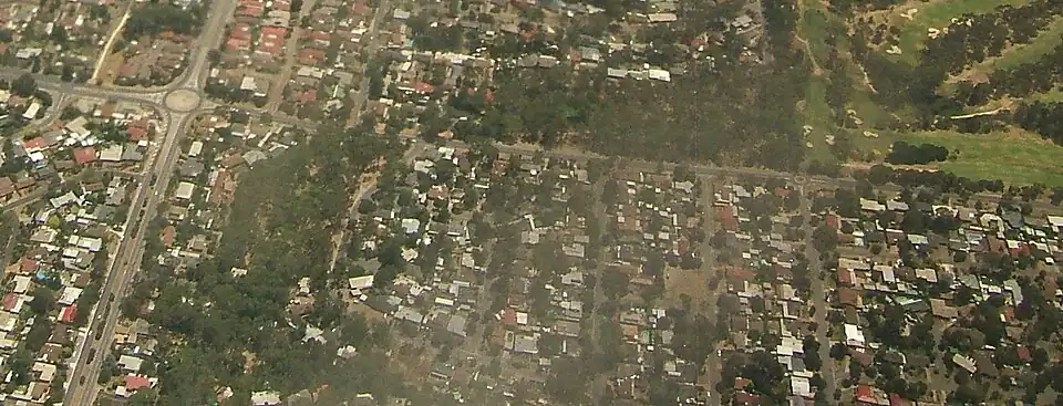 Aerial image of the northwestern part of Banksia Park, looking north. Hancock Road is the north–south road visible on the left-hand side of the image, and Grenfell Road is the east–west road. They intersect at the roundabout in the top-left hand corner. Banksia Park is the area southeast of the roundabout. The green region to the top right is part of Tea Tree Gully Golf Course.