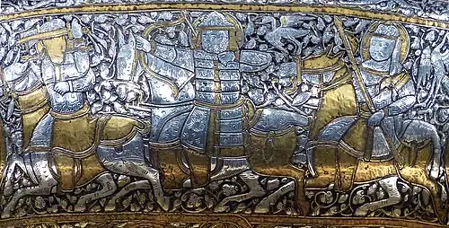 S. Makariou considers R. Ward's hypotheses valid, while other researchers disagree. D. Rice argues, based on the difference in clothing and physical characters of the external friezes, contrasts with the traditional Mamluk costume, that two the basin depicts two distinct groups: panels E1 and E3 depict Turkish emirs and panels E2 and E4 depict Arab servants.[47] Among the emirs, one could be Salar because of his coat of arms, but because of some of the figures around him, like the huntsman (fahhad), the cheetah, and the falconer (bâzyâr) all associated with emirship.[48] The medallions with the scenes of throne might have no particular meaning; on the other hand, there would be narrative continuity between the battle scenes, the severed head being that of the character struck in the previous banner.[49]