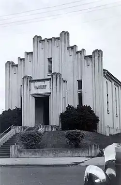 After World War I and years of depression when congregation finances were limited, a scheme to substantially renovate the church was put forward in 1937 during the pastoral term of Rev. Gray A Parker.[11]: 68–69  By the following year the remodelled church was complete,[28] its "futuristic and perpendicular" facade[29] in an Art Deco style that was popular between the world wars but unusual in churches. The front porch was completely replaced and fitted with stained glass, leadlight windows, with matching ones in the front wall, and all of the exterior walls were rendered. The interior alterations included a full-width polished timber vestibule with stained glass, leadlight windows (now removed, matching the design of other new windows in the facade and featuring an arrow and torch motif) and panelling of the vestry with polished timber. The design was completed by GB Gill, the architect for the Sunday School nearly 40 years previously, while the contractor was Mr HE Wildey. Dedication of the renovated church took place on 19 June 1938, when a number of pieces of church furniture were donated: a pulpit table, Communion chair, 2 pulpit chairs, oak hymn-board, crystal vases, pedestal and pulpit hymn book.[1][30][31]