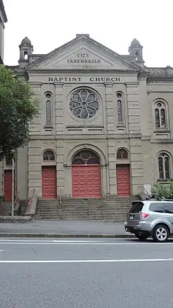 The Baptist City Tabernacle is a large cement rendered church on a corner site overlooking the central business district.[1]