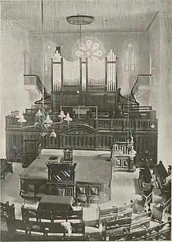 Cedar pews are arranged in a semicircular pattern facing the pulpit, baptistery, organ and choir gallery that are located at the northern end of the space and feature timber panelling. A screen has been built behind the choir. This screen blocks the original view from the auditorium of the north wall with its rose and arched windows and the spiralling timber stairs.[1]