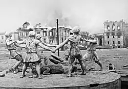 The original fountain is believed to have been installed in the 1930s, when the Soviet Union was being adorned with various outdoor architectural works, including similar fountains designed by sculptor Romuald Iodko, a co-author of the Girl with an Oar, an archetype of the Soviet kitsch. The Barmaley Fountain was made widely known from several August 1942 photographs by Emmanuil Evzerikhin that juxtaposed the carnage of the Battle of Stalingrad with the image of children at play.[1]