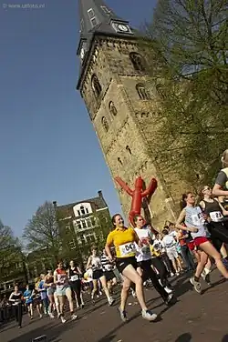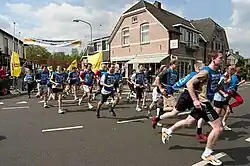 Although mainly a Benelux event, teams from all over the world participate.[5][6] The start is at 22:30 on a Friday at the and ends late in the afternoon of Saturday. All participants wear a vest, which functions as the baton and also hosts a transponder that registers the stage times. The stages range from 3 to 10 km in length, over paved and unpaved terrain. Due to the large number of participants, the start is divided into six groups and there are four restarts along the way, at the Radboud Sports Centre, in Ulft, Barchem and in the city centre of Enschede.[7] In 2017, the first stage was moved to the city center of Nijmegen due to the event's lustrum. This was so successful that it was incorporated into the next editions. As much as it is sports event, it is a social happening, with the athletes and teams ranging from highly trained to those participating "just for the fun of it". Saturday night is host to one of the largest student parties in Europe with over 10,000 visitors. The event is supported by 700 volunteers, of which around 150 motorcycle-bound traffic controllers and many students.