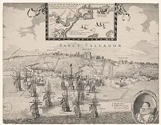 The Battle in the Bay of São Salvador took place on March 3, 1627 when Piet Pieterszoon Hein and his crew spotted about 34 enemy vessels at São Salvador. 16 of the ships were armed but Hein with his three vessels sailed right into the middle after a long battle the Dutch captured 22-25 of the ships with 2,700 chests of sugar, tobacco, and cotton. It was a brilliant success[1][2]
